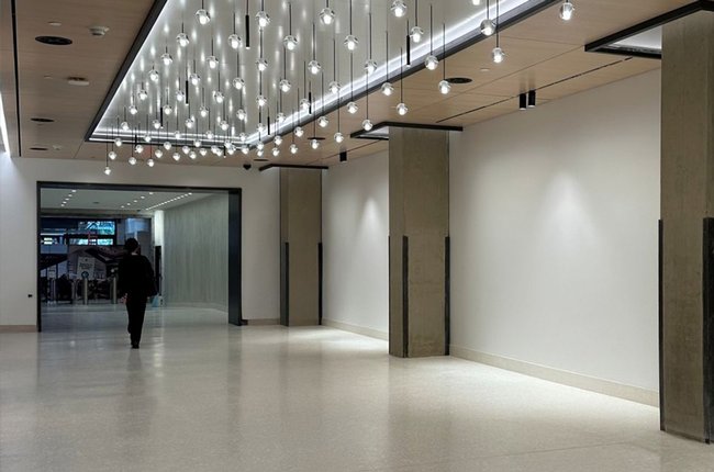 From a design standpoint, the lighting serves as both a navigational tool and a defining feature. It anchors the ceiling visually, drawing the eye upward and emphasizing the linearity of the space. The choice to expose the lights rather than conceal them within fixtures speaks to a raw, industrial sensibility—one that complements the structural honesty of the concrete and the simplicity of the overall palette.