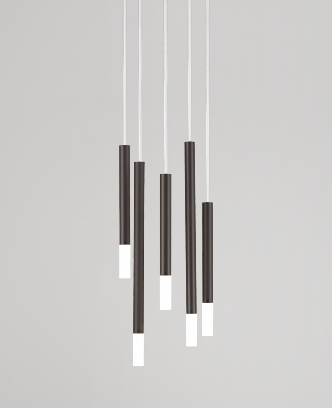 Vibrant chandelier that includes 1" Ø cylinders with an illuminated frosted acrylic that offers a stylish glow. Available in multiple lenghts and canopy options.